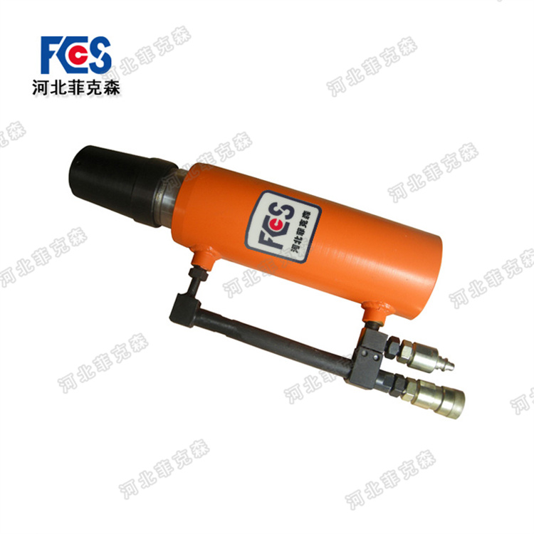 YDC-180型張拉千斤頂由外缸、中缸、內(nèi)缸、錨杯和固定在內(nèi)缸上內(nèi)置工具錨、頂壓器等組成。使用時(shí),先將張拉千斤頂?shù)闹懈淄嘶氐阶畹臀恢茫唁摪澹ㄍ斜P(pán))、外置錨具等套放好,把鋼絞線插入張拉千斤頂?shù)捻斂變?nèi)約150mm,使頂壓器頂緊外置的錨具體,其鎖片則在頂壓器的凹孔內(nèi)可自由退縮,然后使中缸頂出,在中缸頂出的過(guò)程中由于退錨環(huán)脫離固定的內(nèi)置工具錨而使內(nèi)置工具錨的鎖片在彈力推動(dòng)下鎖定鋼絞線,從而在中缸頂出時(shí)鋼絞線不斷被拉伸,外置錨具連同鋼板(托盤(pán))則不斷被頂緊,當(dāng)中缸到頂?shù)筋A(yù)定位置后,退回外缸,外置錨具的鎖片鎖定鋼絞線,從而使鋼絞線處在承載狀態(tài)。頂板則被牢牢托住。中缸退到底后,內(nèi)置工具錨的鎖片松開(kāi),將張拉千斤頂取下。